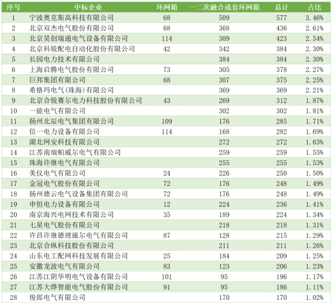 表2國網(wǎng)環(huán)網(wǎng)箱產(chǎn)品中標(biāo)企業(yè)(市場份額超越1%部分)