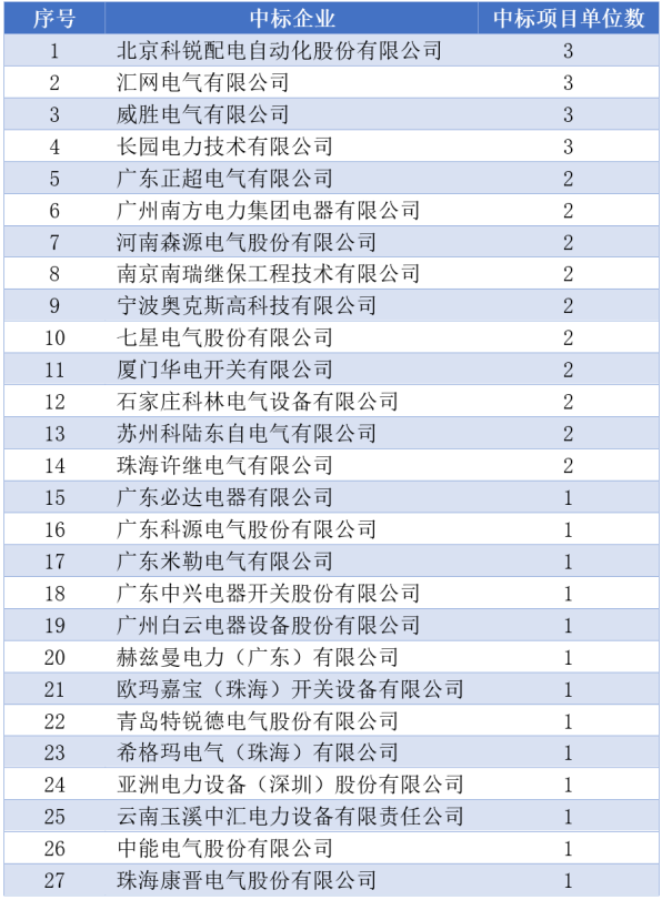 總體中標(biāo)數(shù)量方面,北京科銳配電自動化股份有限公司中標(biāo)金額到達(dá)約2億元;還有4家企業(yè)超越約1億元。