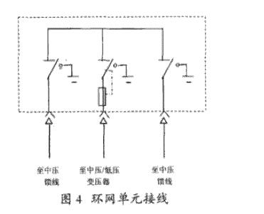 圖4給出了一個(gè)最簡略的全封閉環(huán)網(wǎng)箱的接線圖。中壓饋線的進(jìn)線裝有負(fù)荷阻隔開關(guān),通過一個(gè)串接限流熔斷器的負(fù)荷開關(guān)把變壓器接到環(huán)網(wǎng)體系上,既保護(hù)到變壓器的故障,又能阻隔故障變壓器,使環(huán)網(wǎng)不致斷開?,F(xiàn)在運(yùn)用的柜環(huán)網(wǎng)都是在根本接線單元的基礎(chǔ)上改善、擴(kuò)展而成的。
