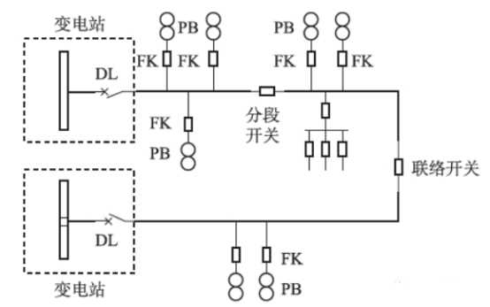 如下圖所示,其作為現(xiàn)階段典型的配電體系拓?fù)鋱D,變電站的10kV出線(xiàn)裝備斷路器和對(duì)應(yīng)維護(hù),主線(xiàn)路中引證開(kāi)關(guān)分段,各分支線(xiàn)路結(jié)合負(fù)荷開(kāi)關(guān)的方法進(jìn)行裝備,且全部開(kāi)關(guān)都具有合閘等功能。由于分段開(kāi)關(guān)與負(fù)荷開(kāi)關(guān)在運(yùn)轉(zhuǎn)期間,難以斷開(kāi)短路電流,所以不需求安裝維護(hù)設(shè)施。其間,圖中的DL歸于斷路器,FK歸于負(fù)荷開(kāi)關(guān),而PB是配變。