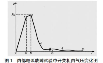 內(nèi)部故障產(chǎn)生的破壞力與電弧產(chǎn)生的間隔容積,電弧電壓,持續(xù)的時間,短路電流大小有關(guān)。在電弧產(chǎn)生后,柜體內(nèi)的壓力過程如圖1所示,壓力過程可以分為四個物理階段風(fēng)圖1。