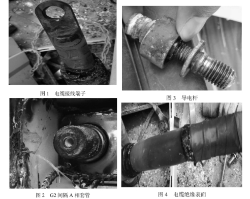 搶修人員對G2間隔電纜撤消后,發(fā)現(xiàn)電纜接線端子(如圖1所示)氧化嚴峻,說明此處遭受過高溫腐蝕,而且應力錐接近端子處的燒蝕痕跡也說明晰插頭受高溫腐蝕;現(xiàn)場發(fā)現(xiàn)端子與環(huán)氧套管銅件的接觸面存在明顯氧化,說明高溫腐蝕時,端子與環(huán)氧套管銅件表面并未完全嚴密貼合;檢查套管內部螺紋亮光正常(如圖2所示),說明導電桿設備緊固。環(huán)氧套管遭受高溫痕跡明顯,且銅件表面與端子接觸面也有很明顯氧化痕跡,說明在高溫產(chǎn)生時,端子與環(huán)氧套管銅件表面并未完全嚴密貼合;現(xiàn)場對導電桿(如圖3所示)進行檢查,發(fā)現(xiàn)變徑螺桿氧化,以及銅嵌件脫離環(huán)氧,熔融附于變徑螺桿上,都說明此處飽嘗過高溫傳導;對電纜應力錐剝除后,發(fā)現(xiàn)電纜絕緣表面(如圖4所示)無明顯爬電痕跡,說明應力體部位未產(chǎn)生爬電缺點,從絕緣受高溫腐蝕和燒蝕判斷,高溫來自端子部位。
