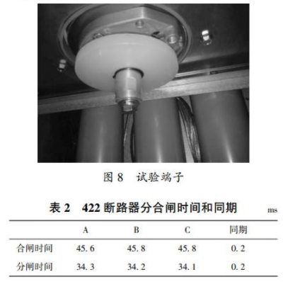 本次試驗(yàn)選取422斷路器進(jìn)行機(jī)械特性檢驗(yàn),按圖6進(jìn)行試驗(yàn)接線。將4221隔絕開關(guān)置于接地方位,將試驗(yàn)端子接到柜內(nèi)電纜接口,然后將試驗(yàn)線接到試驗(yàn)端子下端進(jìn)行試驗(yàn)。試驗(yàn)端子如圖8所示。422斷路器分合閘時(shí)刻和同期見表2。